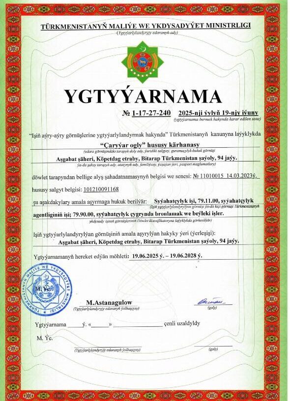 Aşgabatda ýerleşýän türkmen syýahatçylyk kompaniýasy CO Travel, giň gerimli hyzmatlary hödürleýär: Türkmenistanyň wizasyny almak boýunça kömek, myhmanhana ýerleri bronlamak, awiabilet satyn almak, awtoulag kärendesine almak, tejribeli syýahat gollanmalary we terjimeçilik hyzmatlary. Türkmenistanda ynamdar syýahatçylyk operatory hökmünde, biz her bir myhmanyň isleglerine, meýilnamasyna we gyzyklanmalaryna laýyklykda ýöriteleşdirilen turlary guramakda ýöriteleşýäris. CO Travel häzirki zaman we howpsuz awtobuslar bilen üpjün edilen, bu bolsa syýahatyňyzyň amatly we howpsuz bolmagyny üpjün edýär.